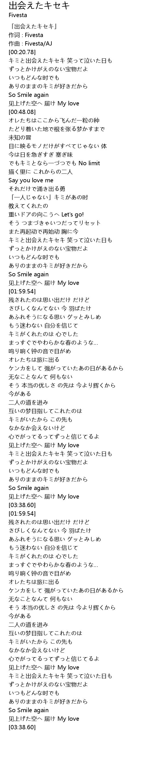 | [01:34.13] | キミと出会えたキセキ 笑って泣いた日も |