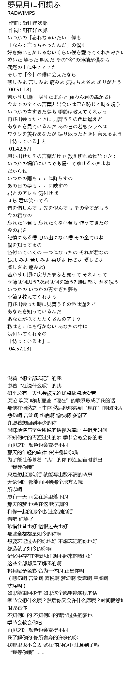 | [00:01.00] | 作词 : 野田洋次郎 |
