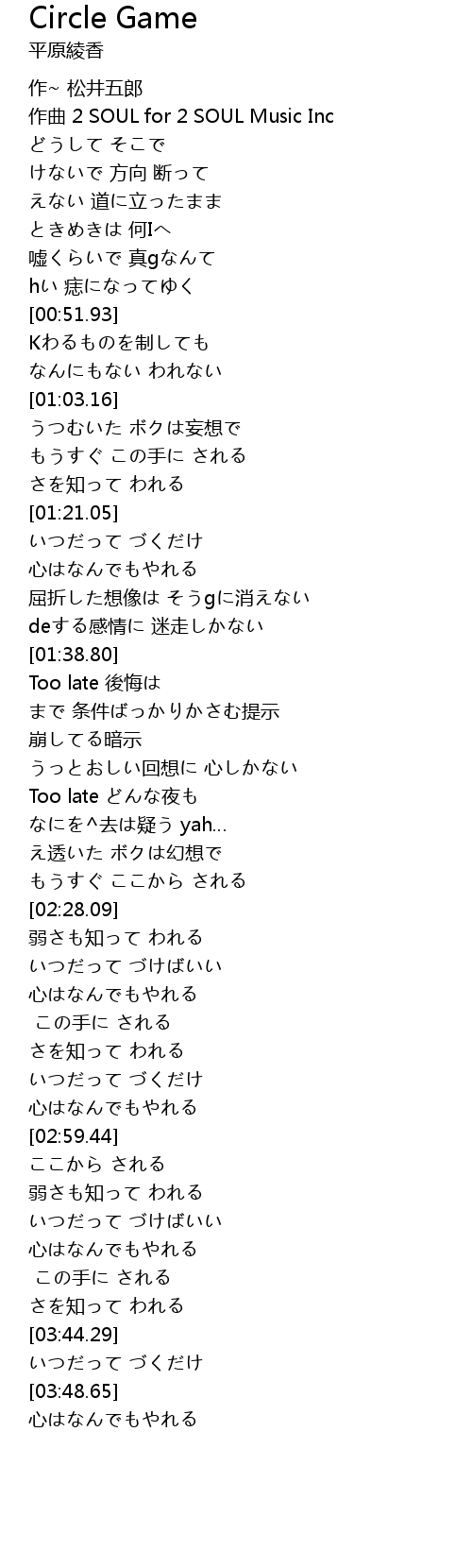 | [01:39.62] | Too late 後悔は |