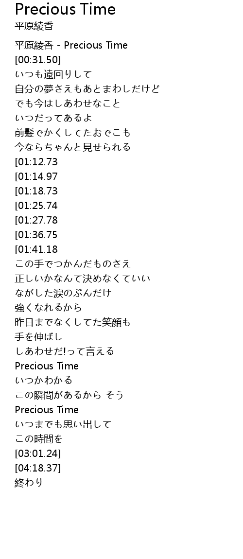 | [00:00.00] | píng yuán líng xiāng Precious Time |