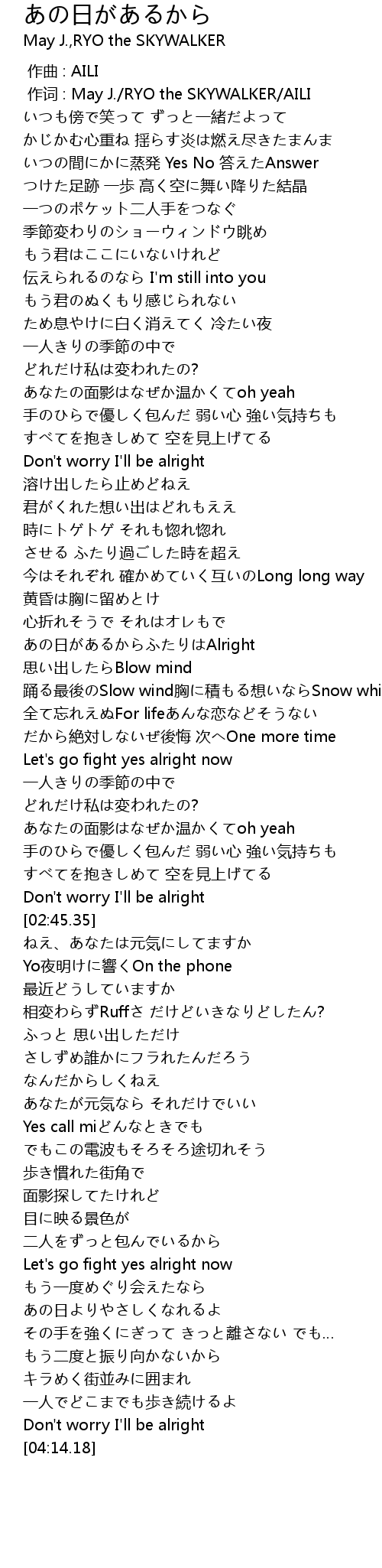 | [01:55.17] | あの日があるからふたりはAlright |