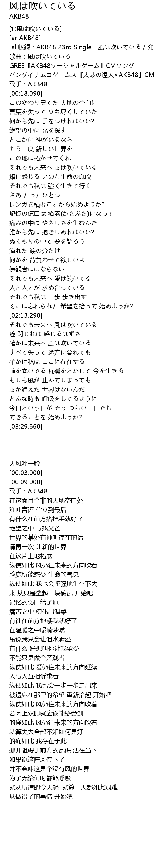 | [00:09.000] | tai gu da ren AKB48 CM |