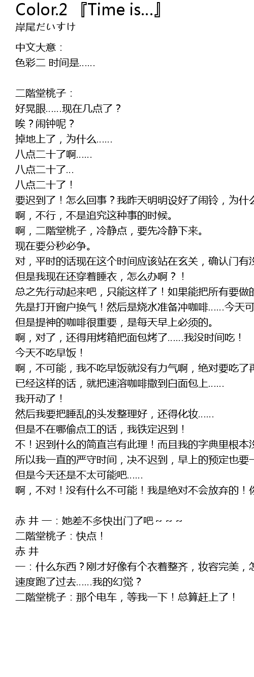 | 对,平时的话现在这个时间应该站在玄关,确认门有没有锁好,想着车站开始出发了。 | |