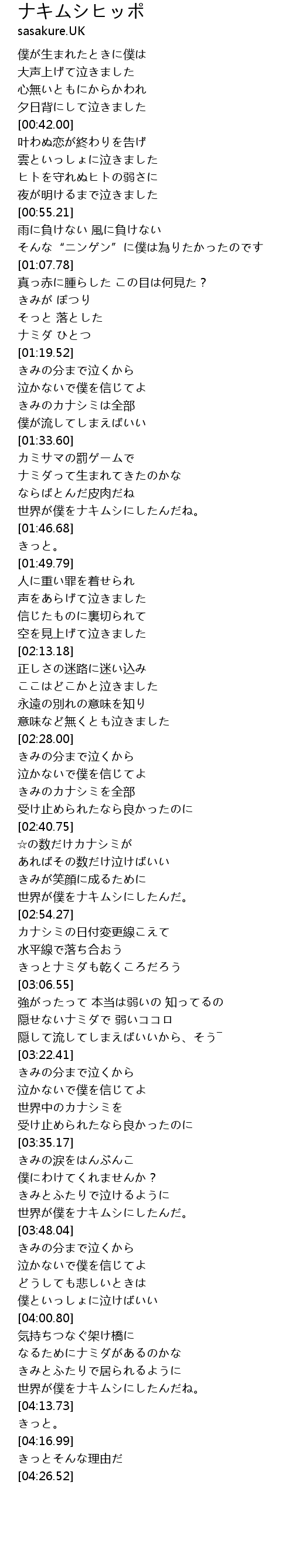 | [01:42.61] | 世界が僕をナキムシにしたんだね。 |