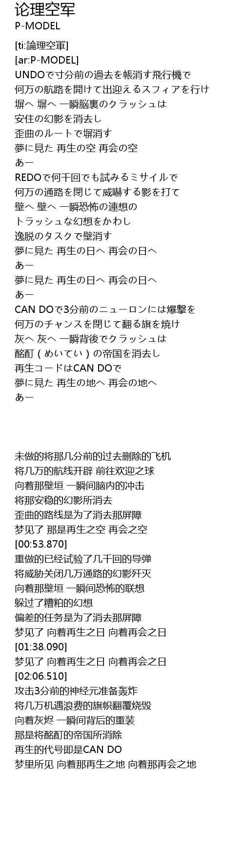 | [00:28.19] | UNDOで寸分前の過去を帳消す飛行機で |