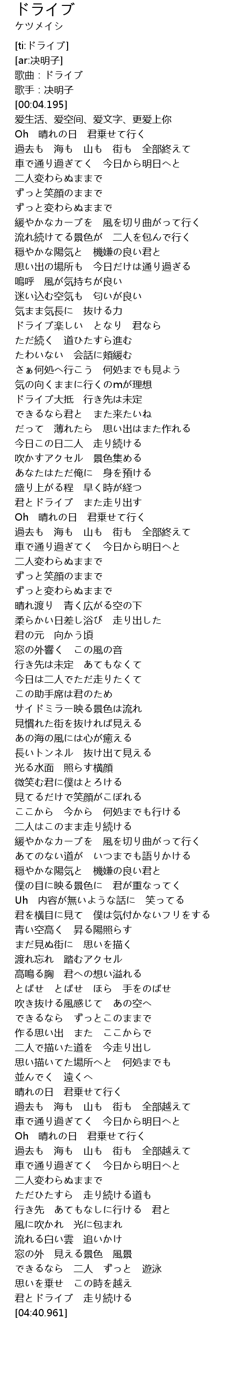 | [04:33.547] | 君とドライブ 走り続ける |