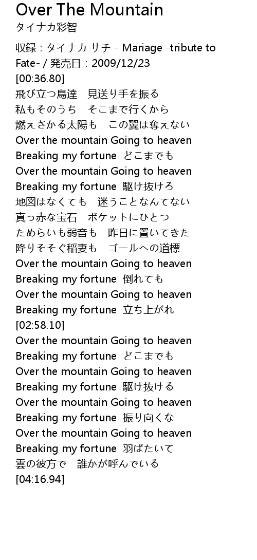 | [01:16.93] | Over the mountain Going to heaven |