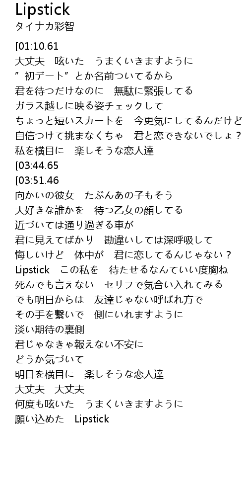 | [00:00.00][01:10.61][03:30.72] | Lipstick 願い込めた どうか力を貸してお願い |