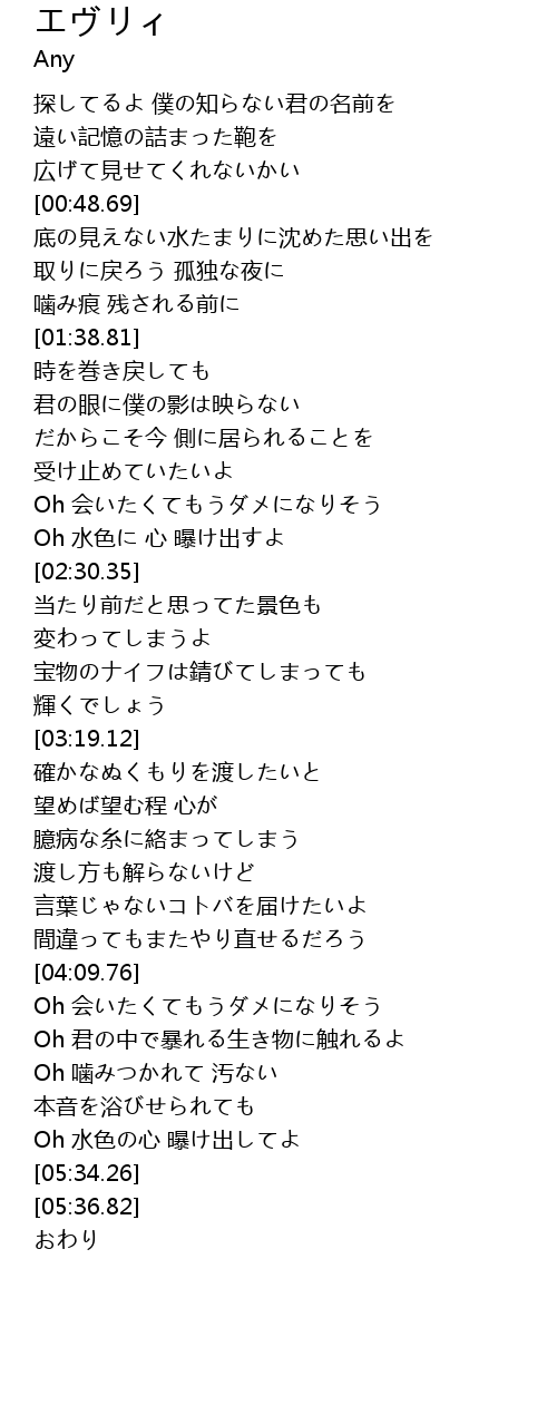 | [04:53.39] | Oh 君の中で暴れる生き物に触れるよ |
