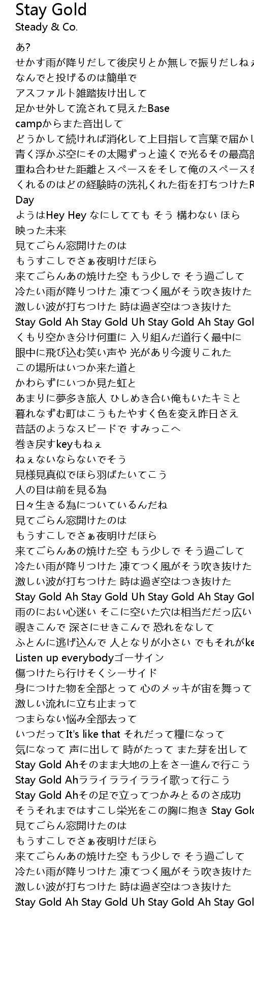 | [03:33.91] | Stay Gold Ahそのまま大地の上をさー進んで行こう |