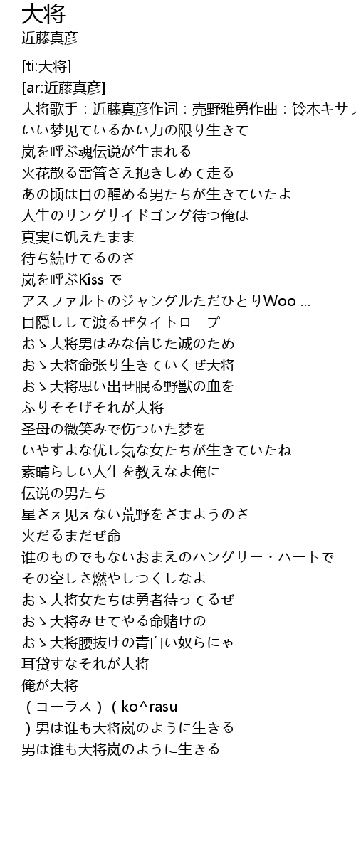 | [04:01.115] | (コーラス)(ko^rasu )男は谁も大将岚のように生きる |