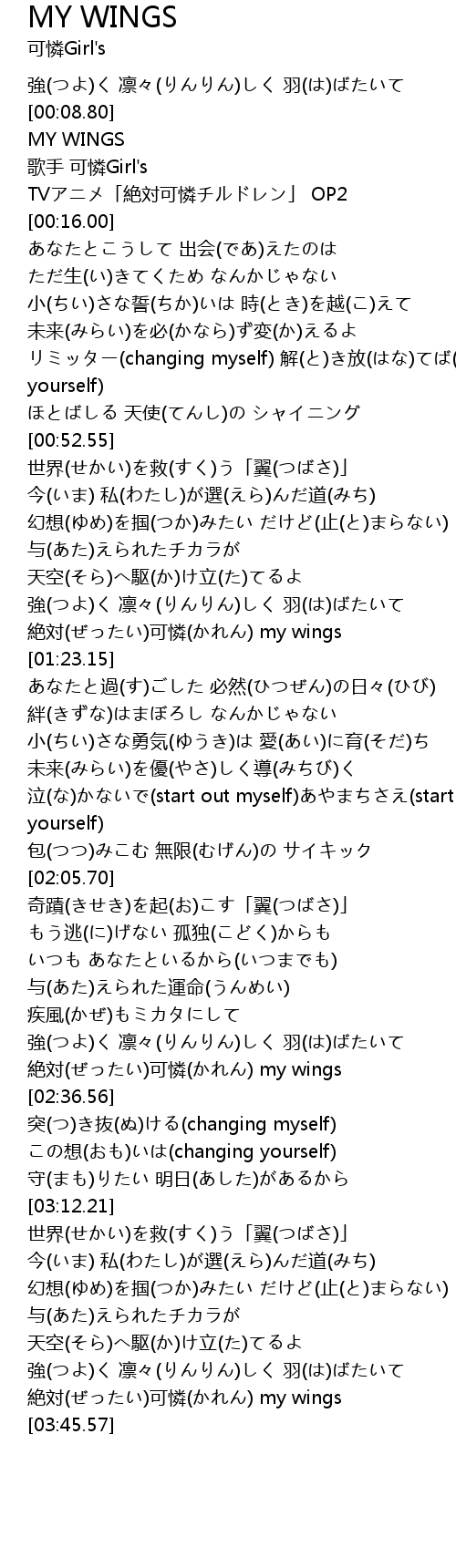 | [03:39.55] | 絶対(ぜったい)可憐(かれん) my wings |