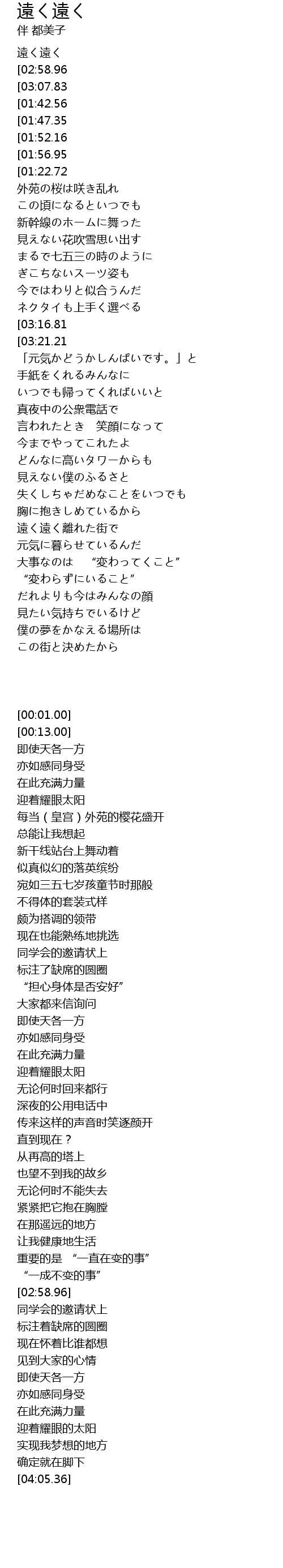 | [00:13.00][02:58.96][04:05.36] | 伴都美子-遠く遠く |