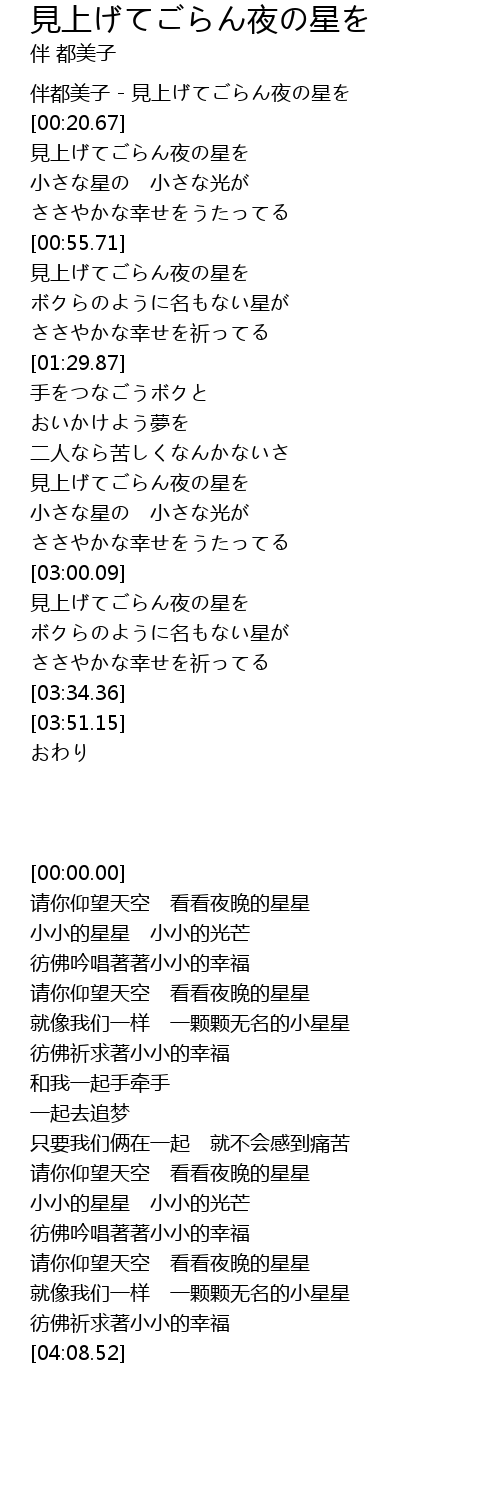 | [00:00.00] | 伴都美子 - 見上げてごらん夜の星を |