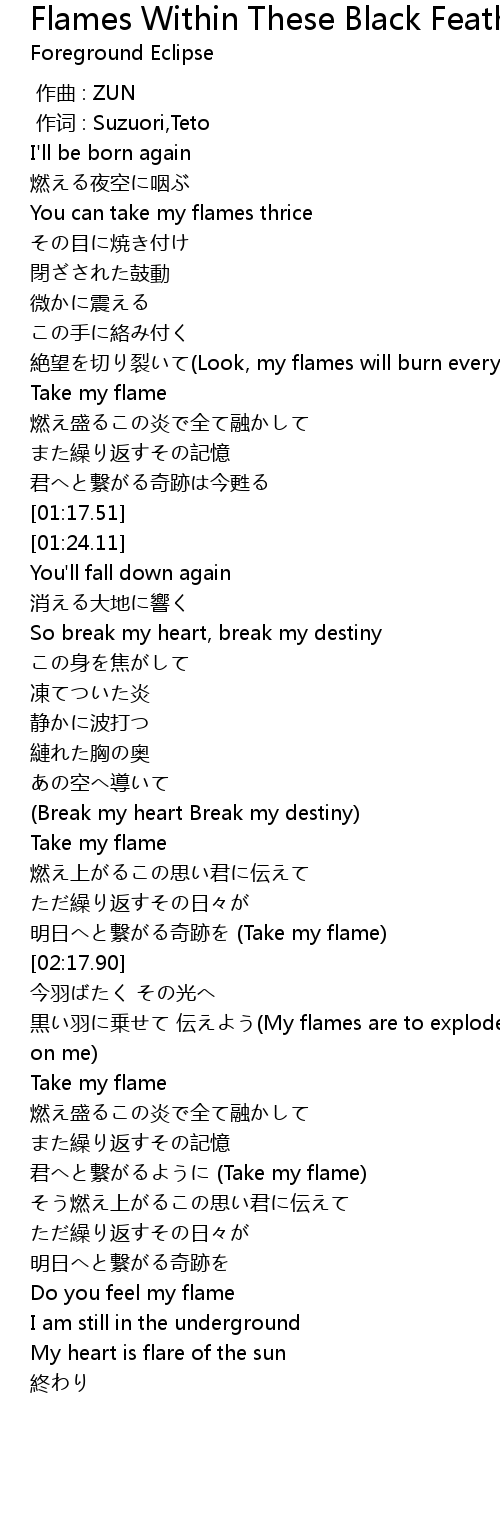| [02:35.24] | 黒い羽に乗せて 伝えよう(My flames are to explode Just count on me) |