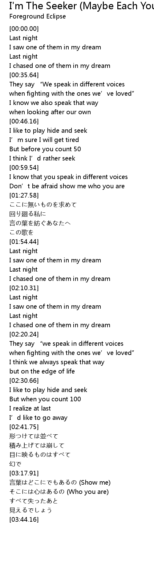 | Song | I'm The Seeker (Maybe Each Your Word Calls For It) |