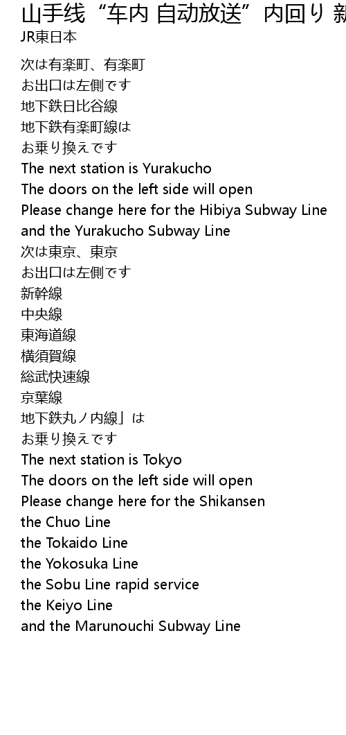 | Song | 山手线“车内 自动放送”内回り 新桥~有楽町~东京 |