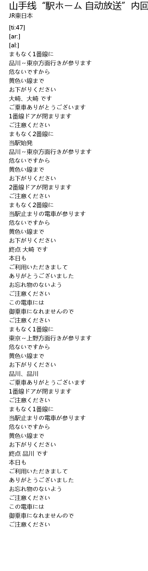 | Song | 山手线“駅ホーム 自动放送”内回り 大崎・[大崎始発]・[大崎行き]・品川・[品川行き] |