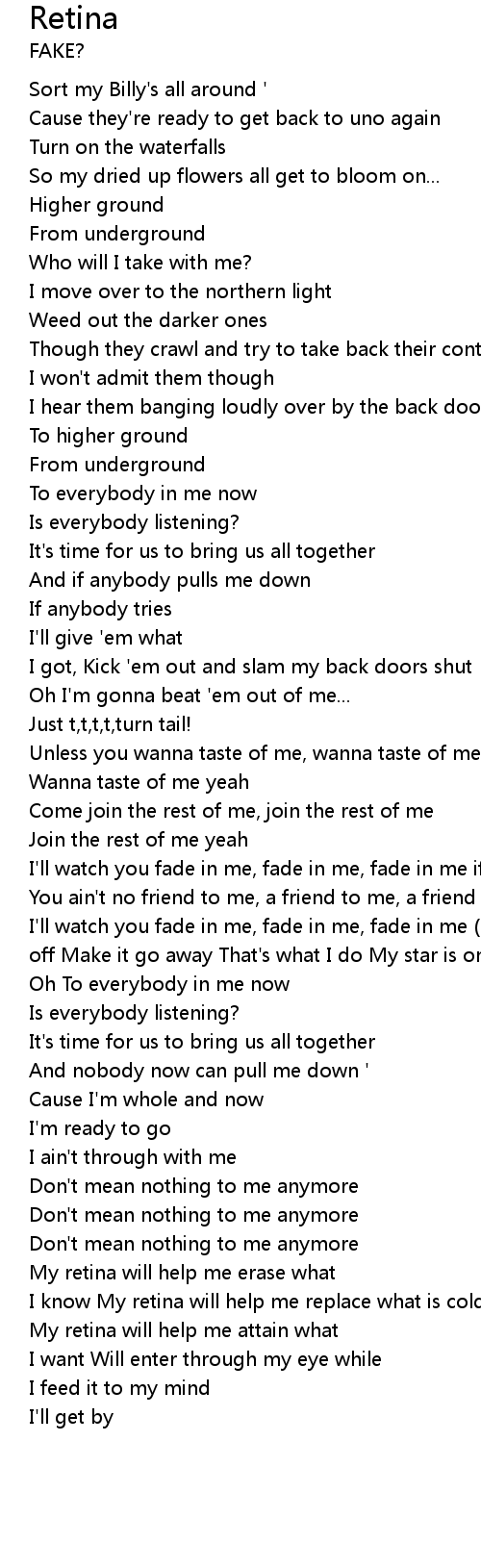 I'll watch you fade in me, fade in me, fade in me (The scars I own I peel them off Make it go away That's what I do My star is on I feel the cold burning...) |