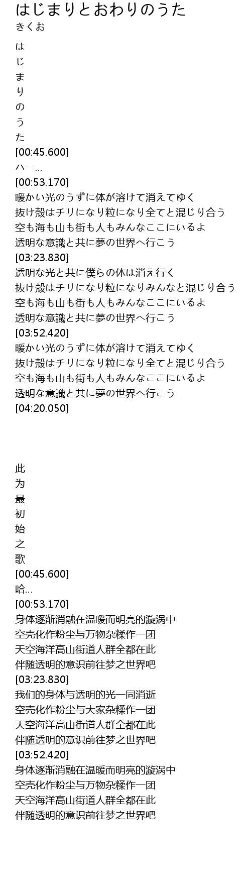 | [03:59.440] | 抜け殻はチリになり粒になり全てと混じり合う |