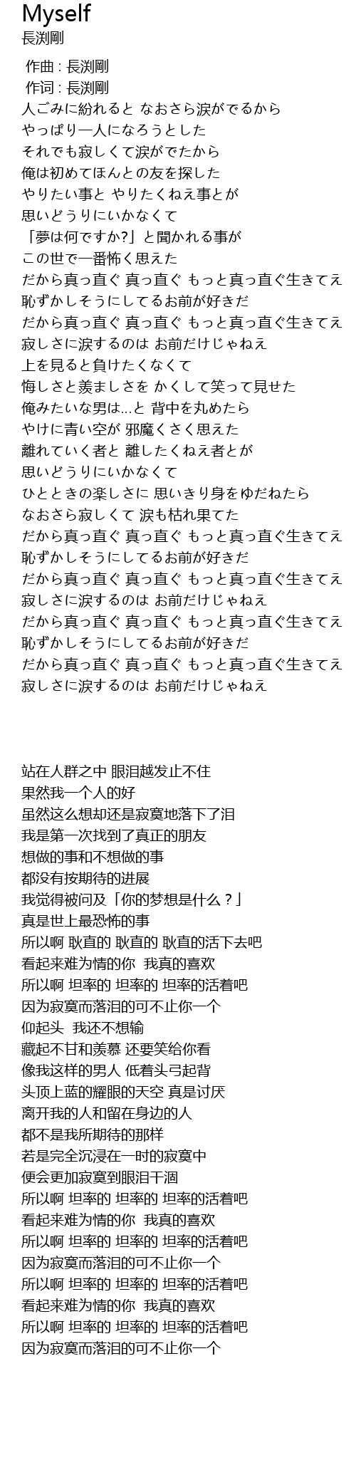 | [01:37.20] | だから真っ直ぐ 真っ直ぐ もっと真っ直ぐ生きてえ |