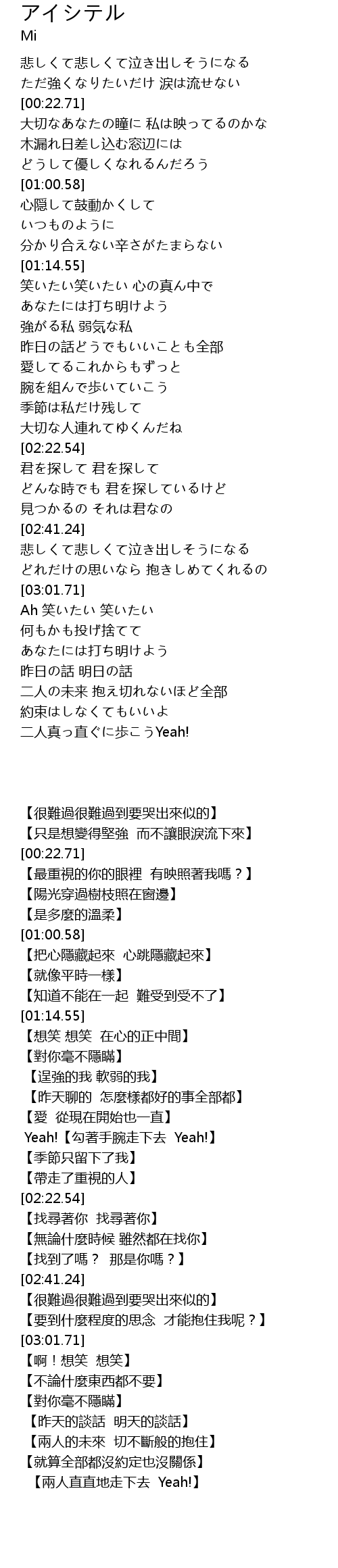 | [00:25.94] | 大切なあなたの瞳に 私は映ってるのかな |