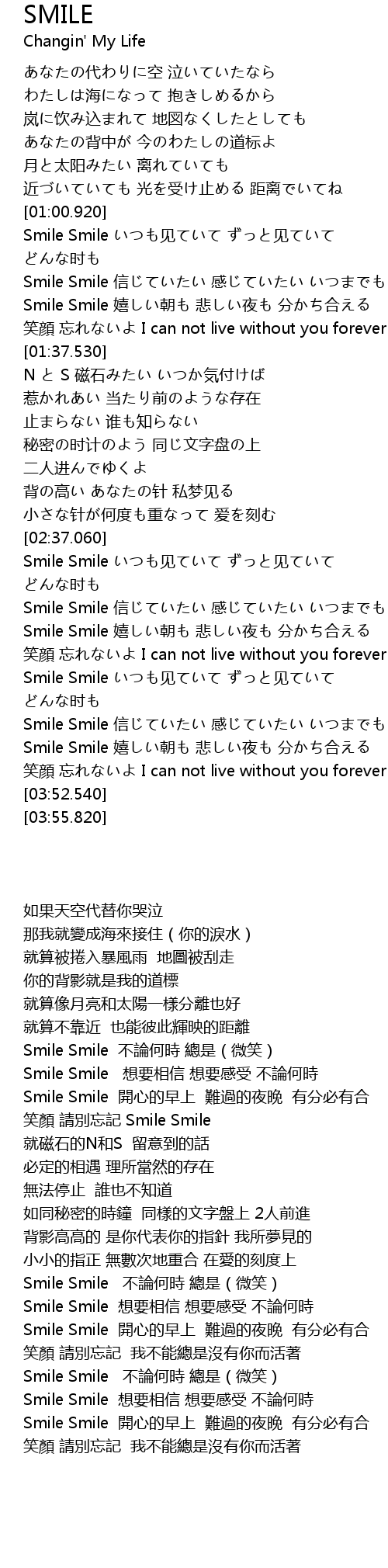 | [02:51.930] | Smile Smile 嬉しい朝も 悲しい夜も 分かち合える |