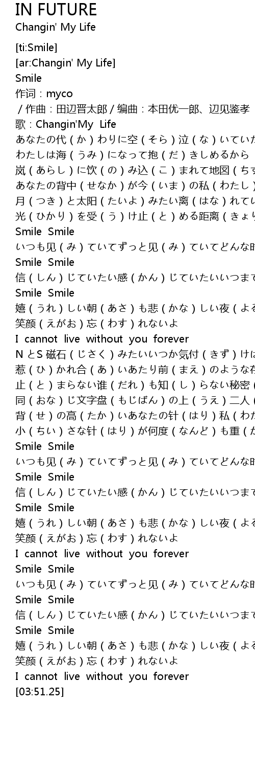 | [02:51.59] | Smile Smile 嬉(うれ)しい朝(あさ)も悲(かな)しい夜(よる)も分(わ)かち合(あ)える |