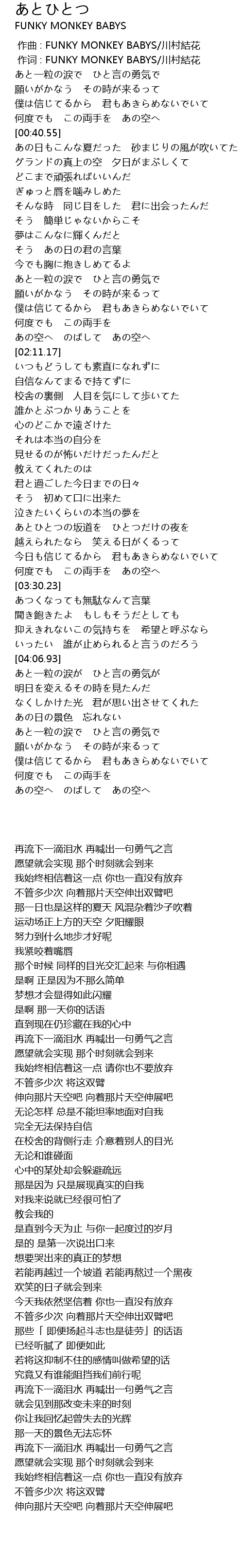 | [00:01.00] | 作词 : FUNKY MONKEY BABYS/川村結花 |