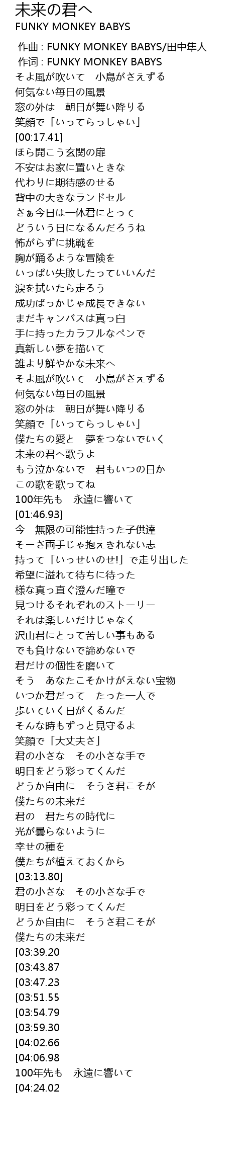 | [00:00.00] | zuò qǔ : FUNKY MONKEY BABYS tián zhōng sǔn rén |