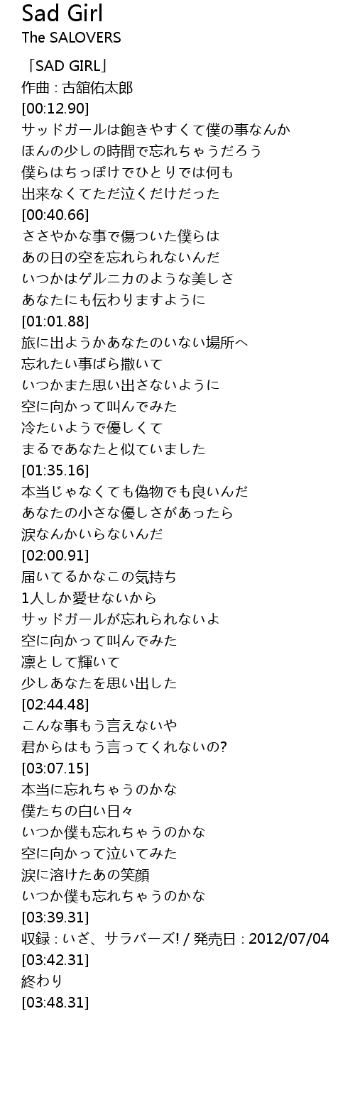 | [00:21.33] | サッドガールは飽きやすくて僕の事なんか |