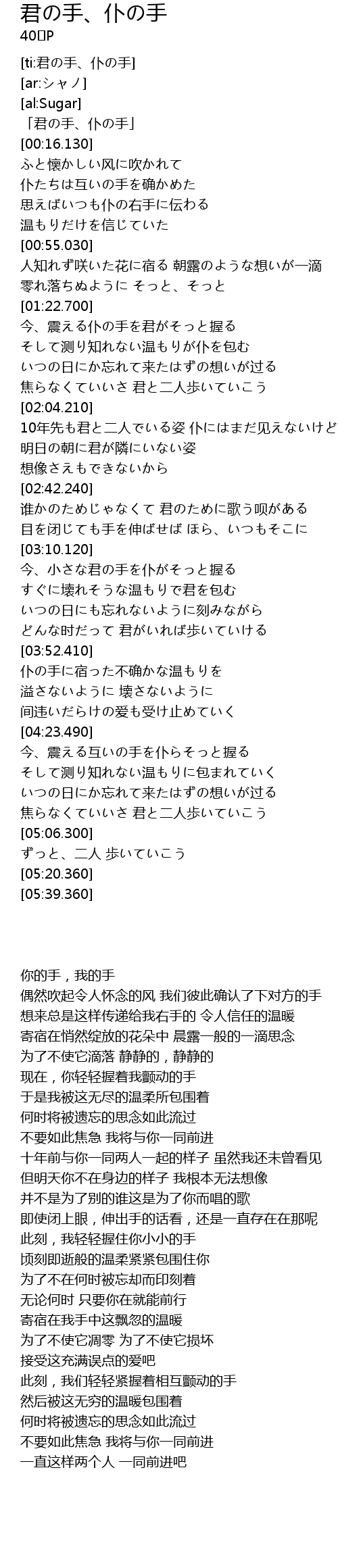 | [00:37.340] | 思えばいつも仆の右手に伝わる 温もりだけを信じていた |