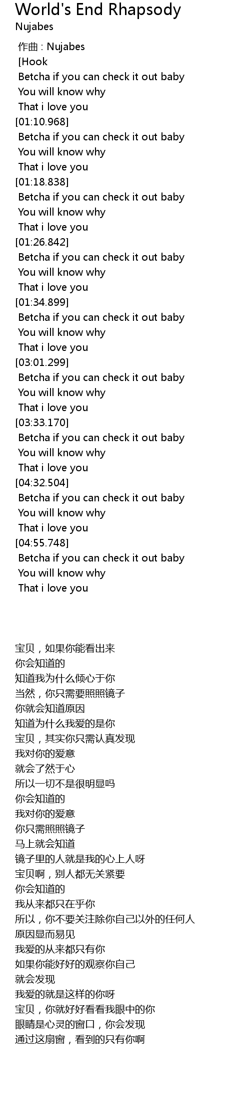 | [01:35.194] | Betcha if you can check it out baby |