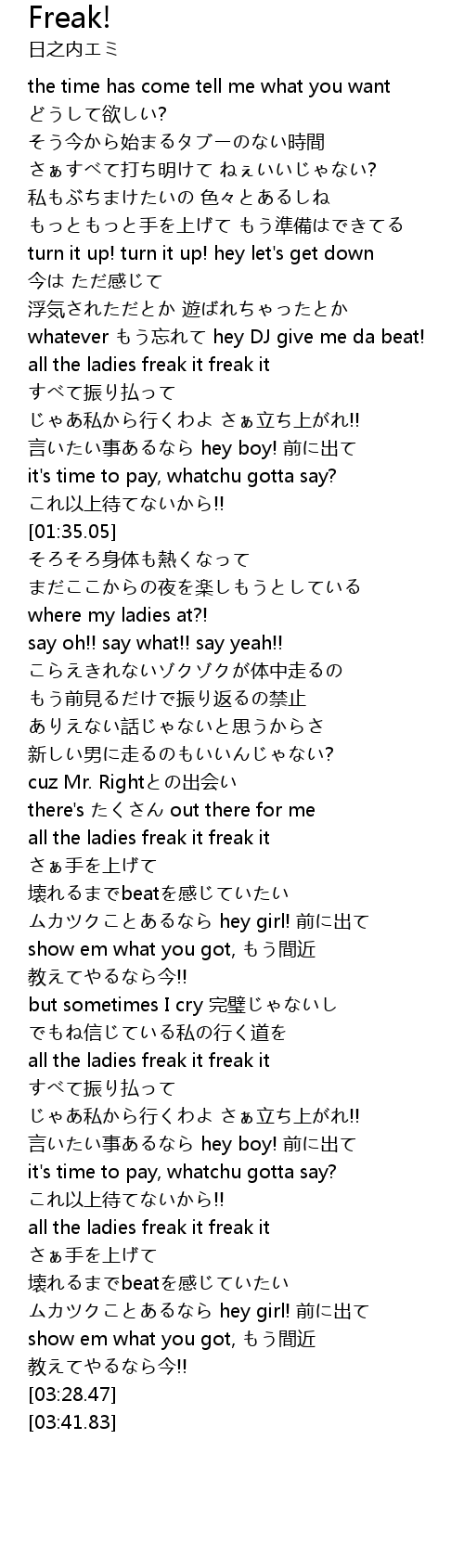 | [01:12.34] | whatever もう忘れて hey DJ give me da beat! |