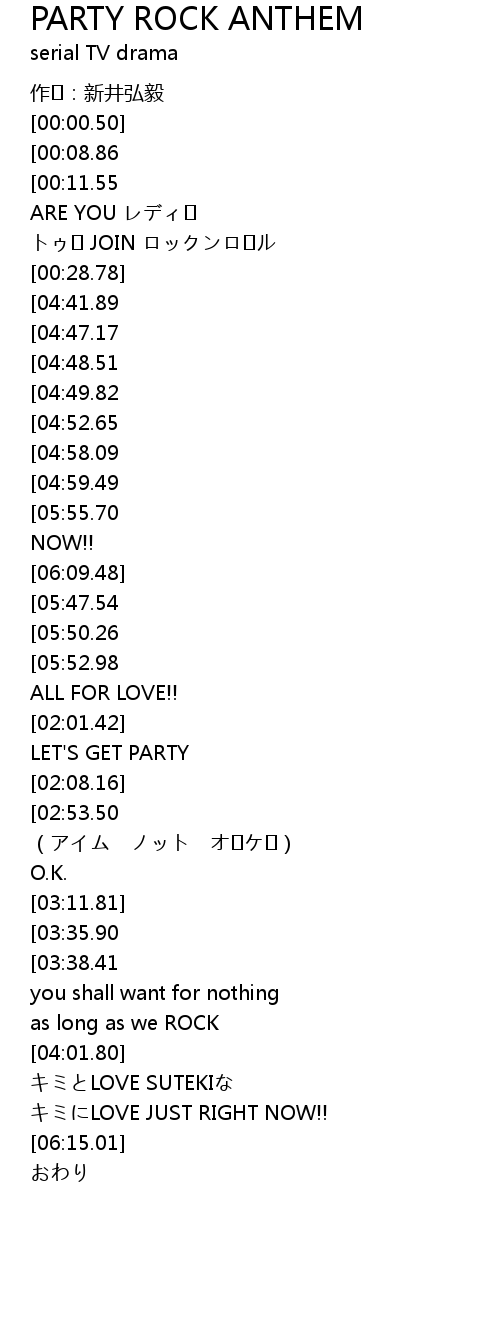 | [05:58.61][05:47.54][05:36.51][05:25.65][01:50.44] | PARTY ROCK PARTY ROCK |