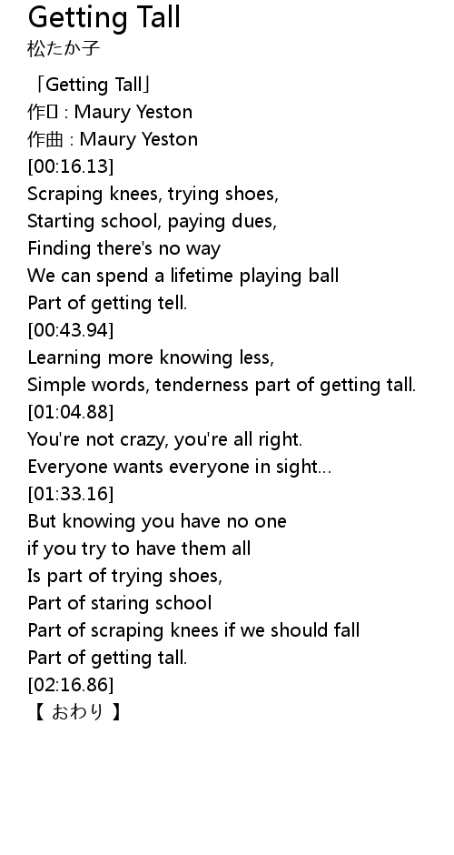 | [00:54.20] | Simple words, tenderness part of getting tall. |