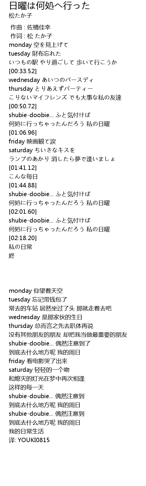 | [01:54.12] | 何処に行っちゃったんだろう 私の日曜 |
