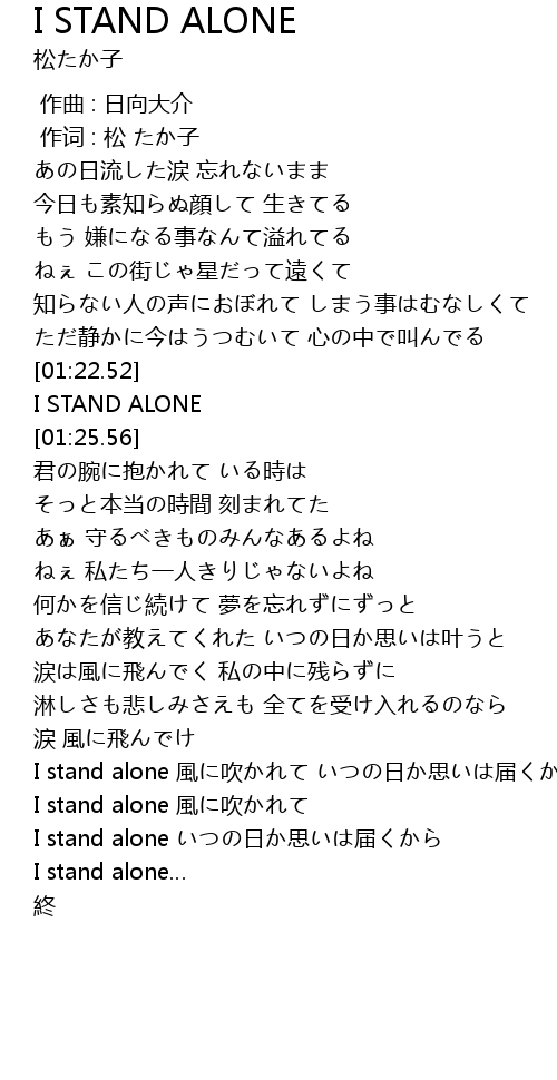 | [03:12.68] | I stand alone 風に吹かれて いつの日か思いは届くから |