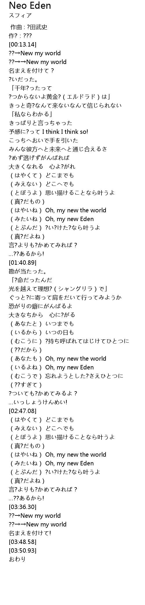 | [01:25.15] | (みたいね) Oh, my new Eden |