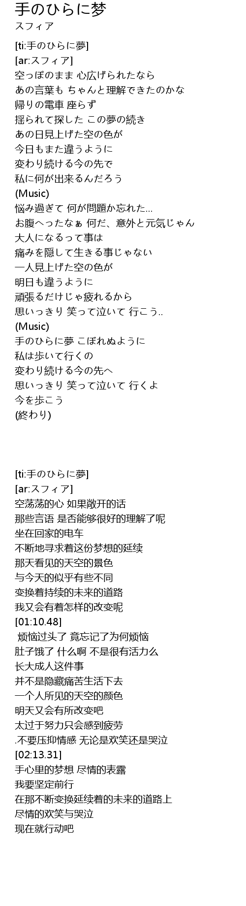 | [02:33.80] | 手のひらに夢 こぼれぬように |