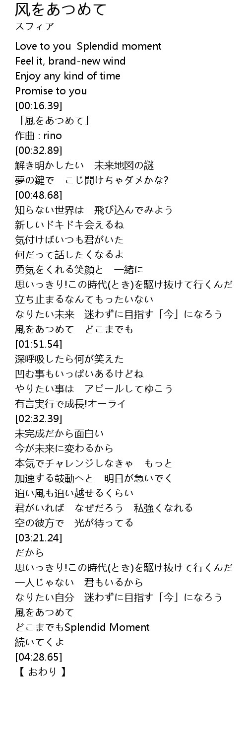 | [04:09.67] | なりたい自分 迷わずに目指す「今」になろう |