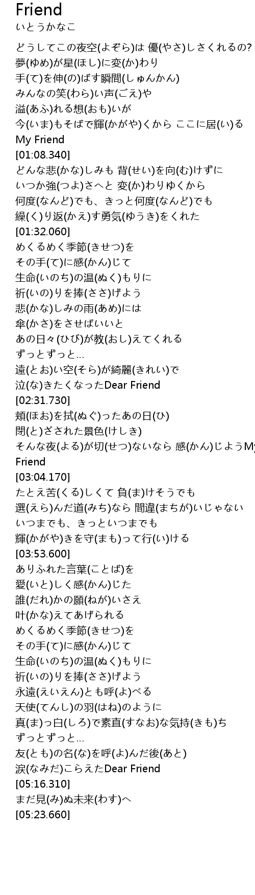 | [05:05.760] | 友(とも)の名(な)を呼(よ)んだ後(あと) 涙(なみだ)こらえたDear Friend |
