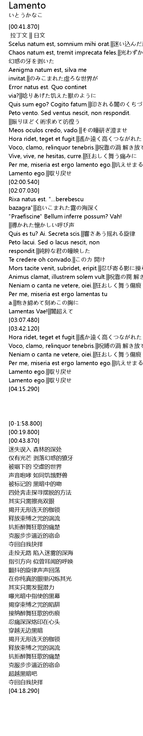 | [03:54.700] | Per me, miseria est ergo lamento ego.||抗えせまる宿命超えて |