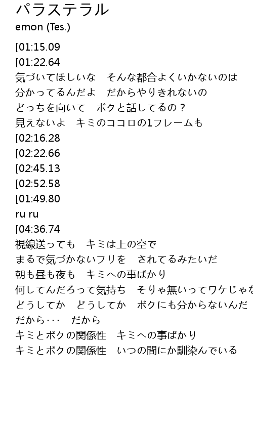 | [00:00.00][01:15.09][02:30.16][03:31.98] | キミとボクの関係性 一体いつまでこんななの? |