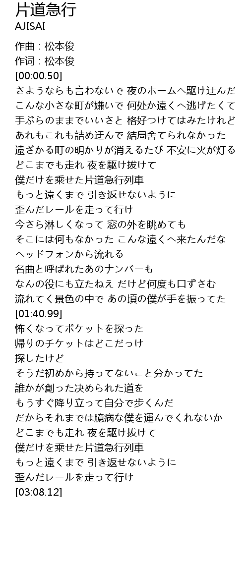 | [00:55.54] | 僕だけを乘せた片道急行列車 |