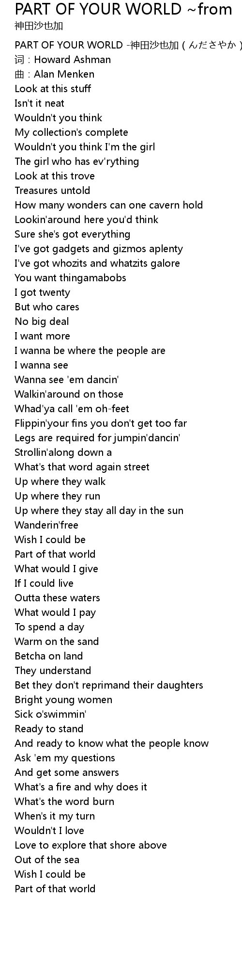 | [00:00.00] | PART OF YOUR WORLD -神田沙也加(んださやか) |