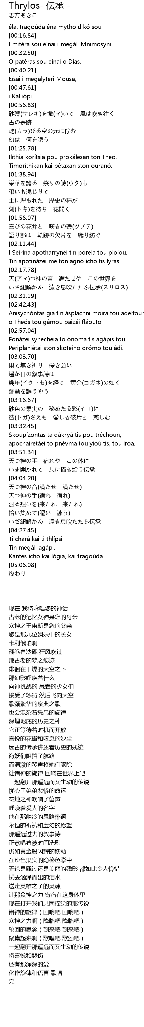 | [04:55.77] | Ka ntes i cho kai lo gia, kai tragou da. |