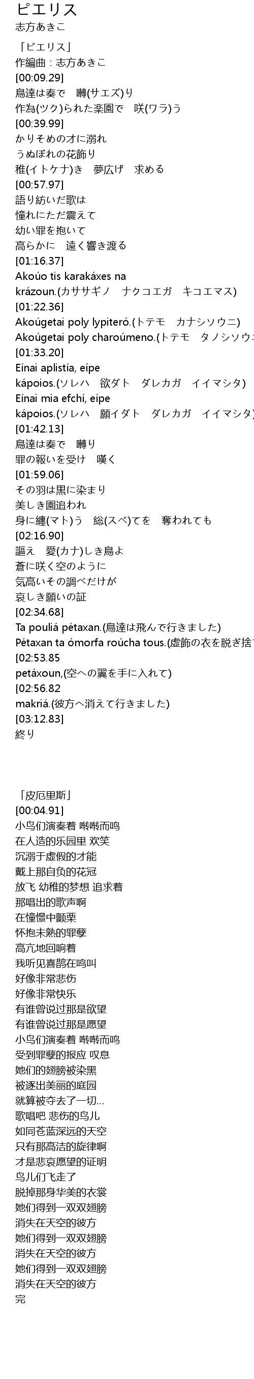 | [03:00.81][02:53.85][02:43.26] | Apéktisan fterá gia na petáxoun,(空への翼を手に入れて) |