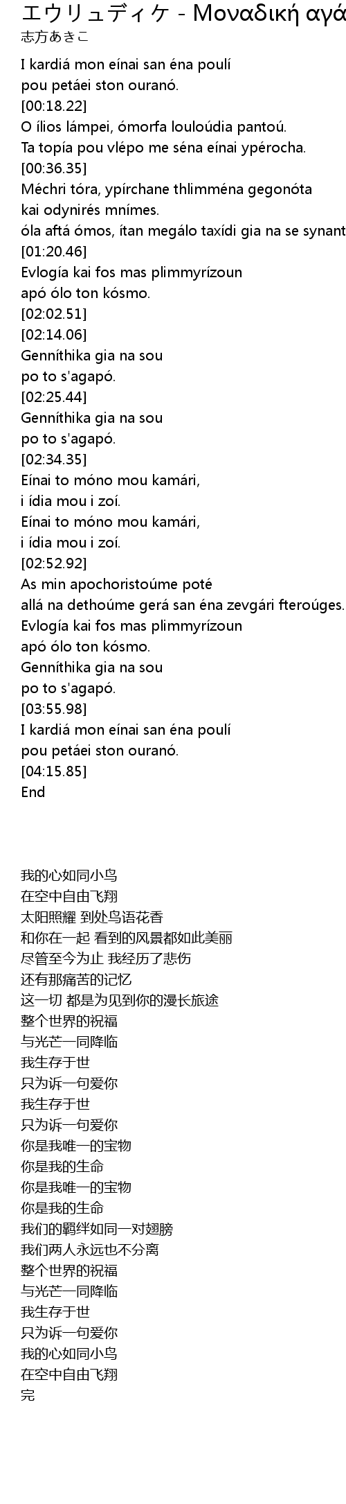 | [00:01.17] | I kardiá mon eí nai san é na poulí |