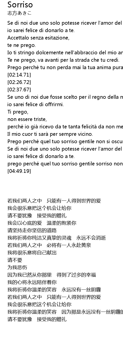 | [04:26.32] | prego perche quel tuo sorriso gentile sorriso non si oscuri mai |
